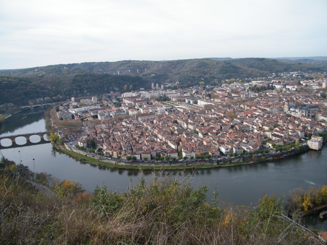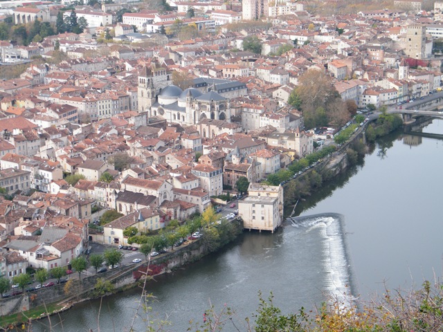 Had a leisurely buffet breakfast at the Hotel, the usual croissants, raisin pastries, French bread, as well as (cold) boiled eggs, fruit salad, yoghurt and cereal. Visited an estate agent in the town (Yanec Lance), who let us peruse about five large books of real estate on offer. We arranged for him to take us to visit three properties later in the afternoon at a time which suited him. He recommended that meantime it would be nice for us to visit Le Mont Saint Cyr, a look-out high up and with a spectacular view  of the entire city and River Lot, as well as the Cathedral St. Etienne.
